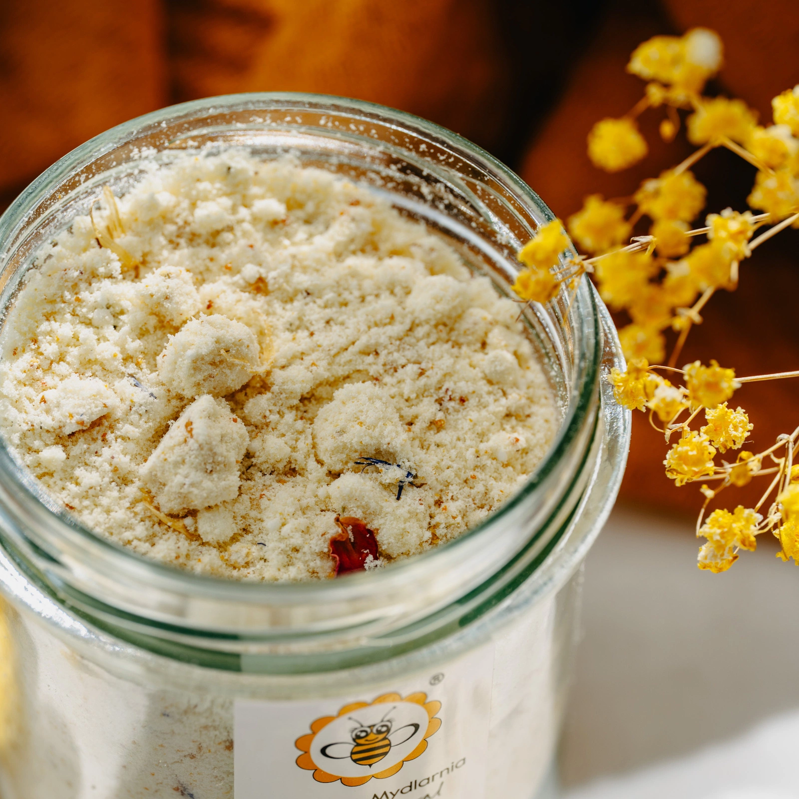 Składniki: soda oczyszczona, mleko w proszku, miód w proszku, pyłek pszczeli, kwasek cytrynowy, mączka ziemniaczana, olej marchwiowy, olejek zapachowy, płatki bławatka i nagietka, kwiat bzu czarnego, płatki róży