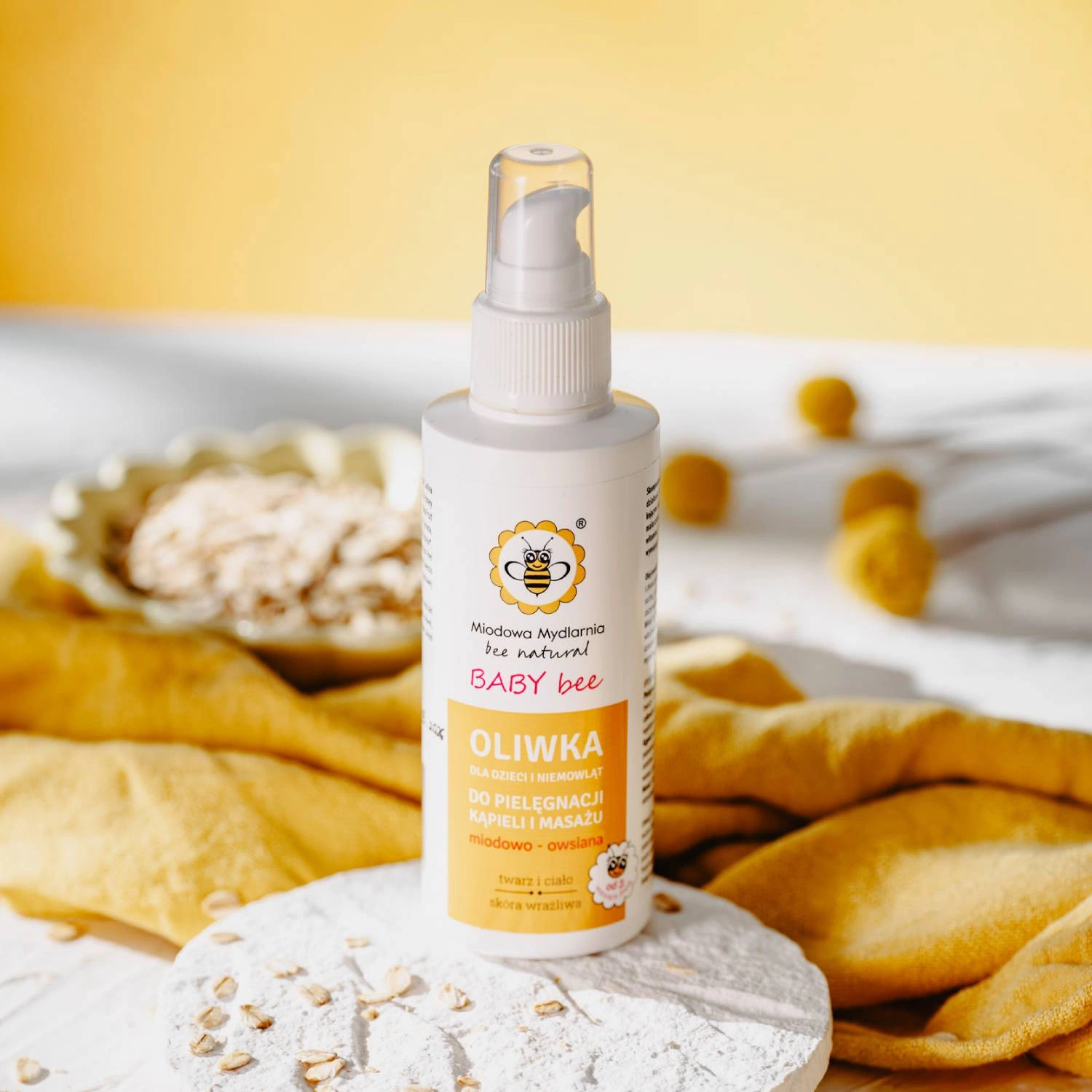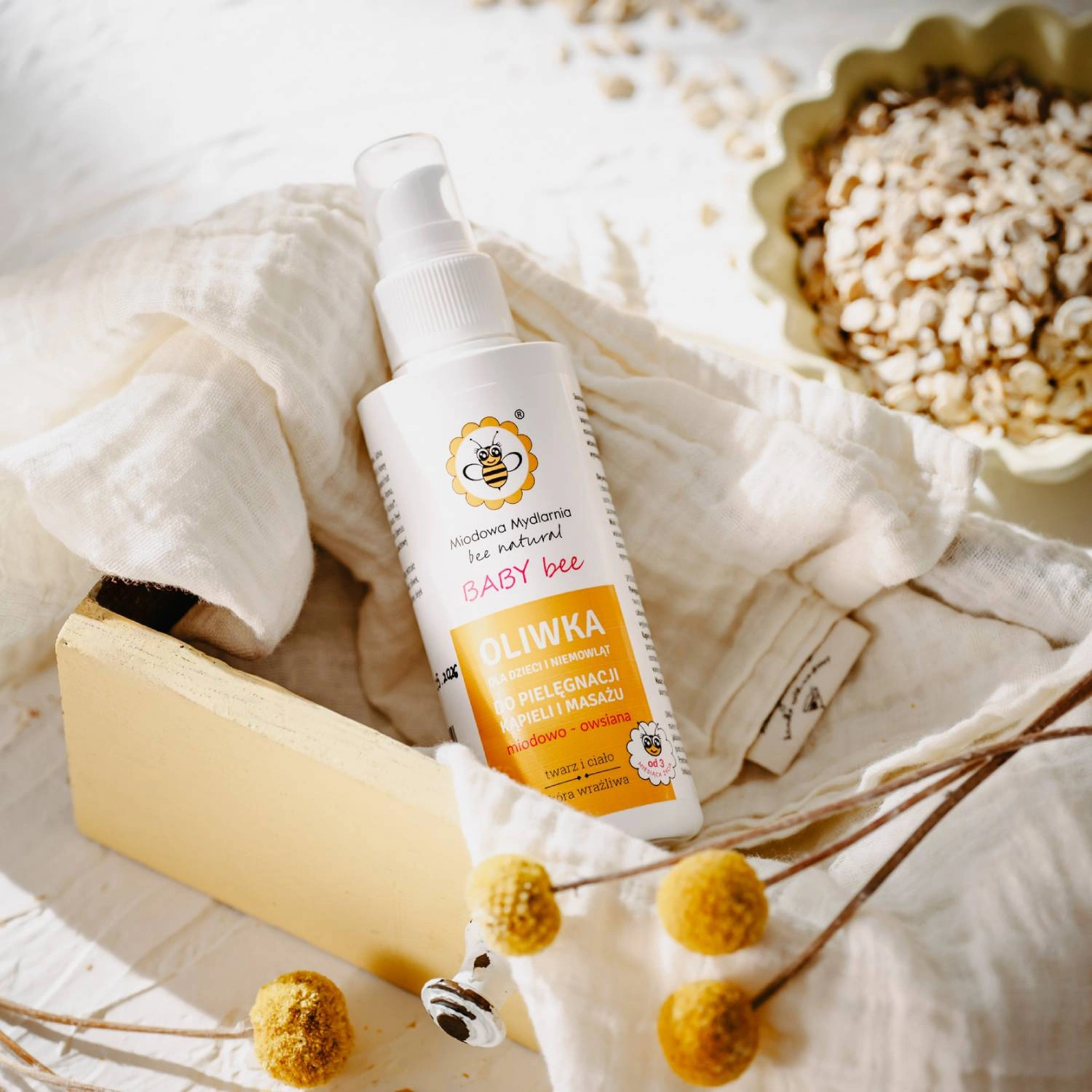 Oliwka dla dzieci i niemowląt MIODOWO–OWSIANA to lekki, szybko wchłaniający się preparat stworzony z myślą o codziennej pielęgnacji delikatnej skóry maluszków od 3. miesiąca życia. Jej formuła opiera się na naturalnych olejach roślinnych, takich jak olej owsiany, winogronowy, jojoba i arbuzowy, które intensywnie nawilżają, odżywiają i chronią skórę dziecka. Dodatek miodu potęguje właściwości łagodzące i regenerujące, wspierając naturalną barierę ochronną skóry.