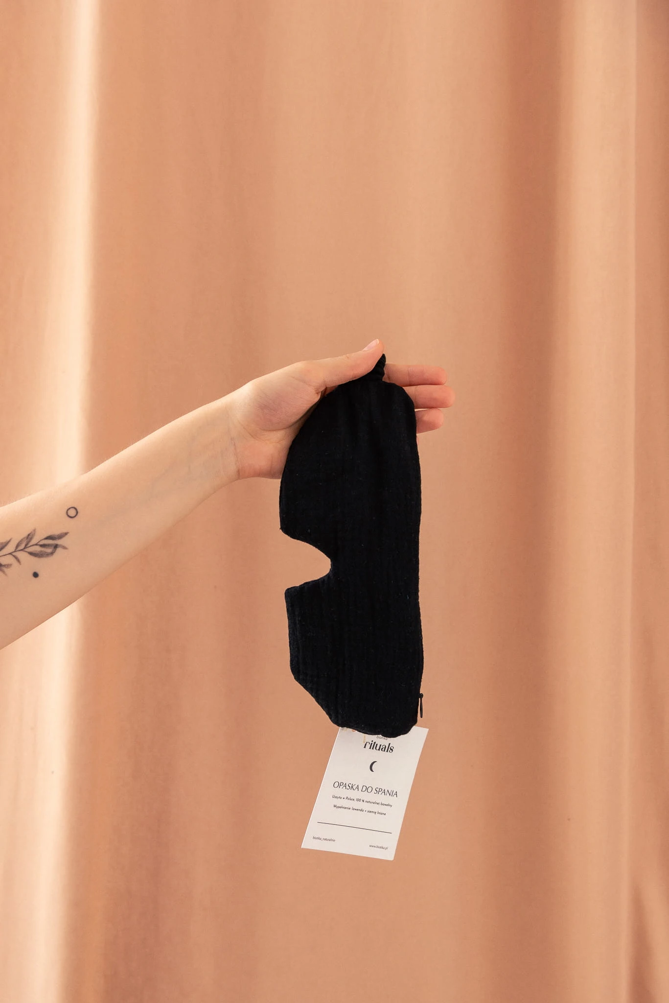 Opaska składa się z części wypełnionej lawendą oraz siemieniem lnianym i zewnętrznej opaski, którą można prać w temperaturze max. 30 stopni.