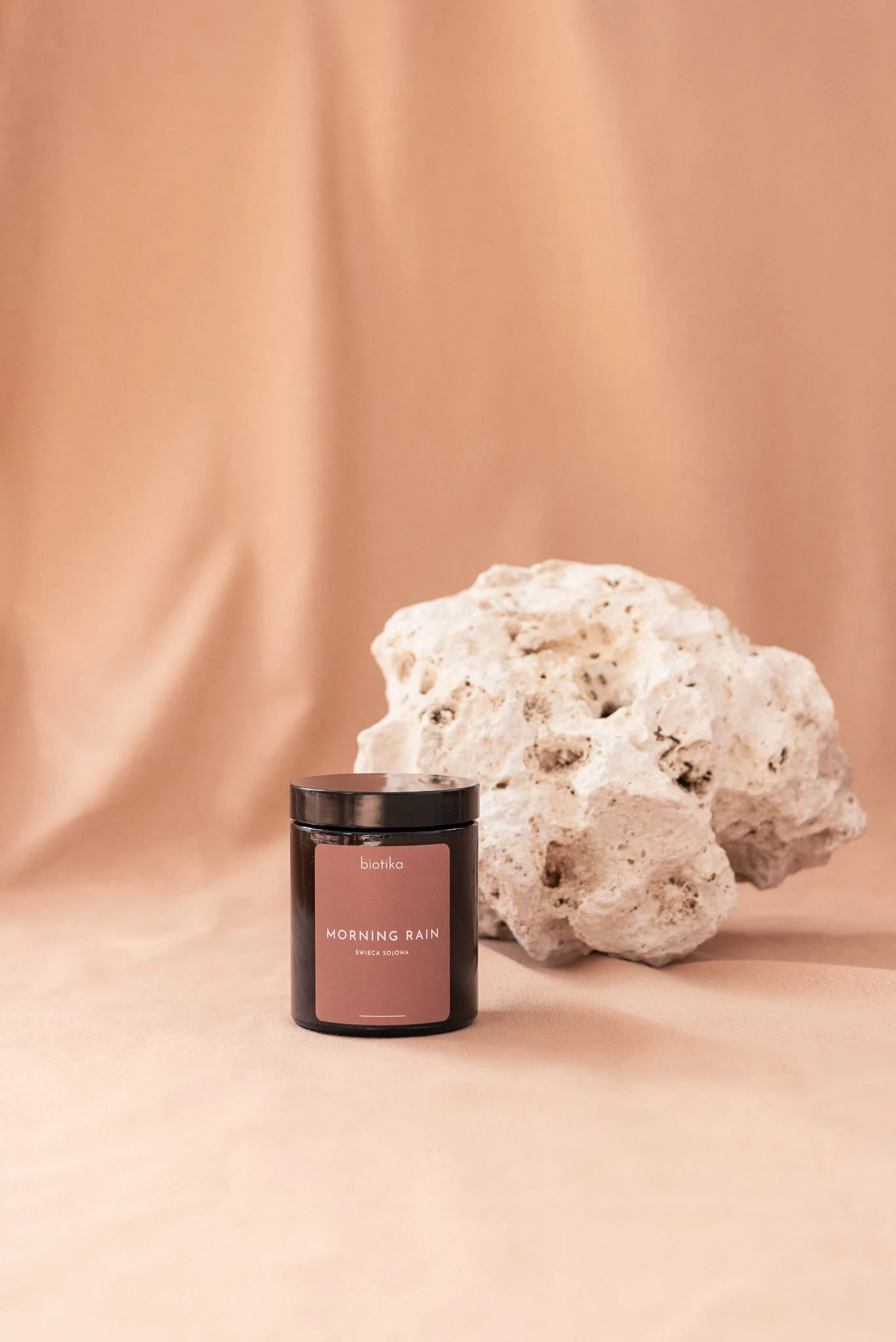 Świeca z wosku sojowego Morning rain to kompozycja kojarząca się ze spacerem po łące, relaksem i odpoczynkiem.