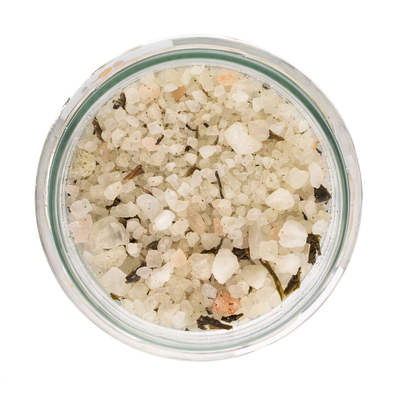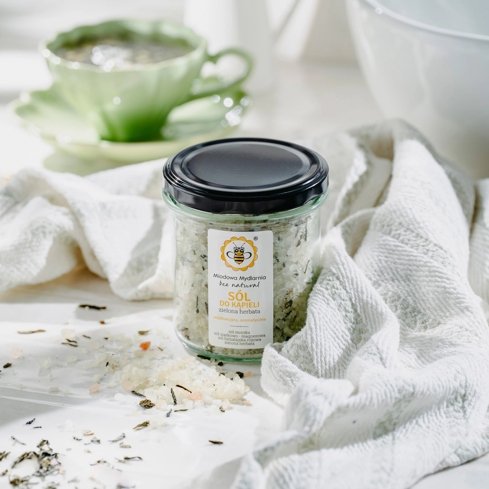 Składniki: sól morska, sól angielska – Epsom, różowa himalajska, tapioka, olejek zapachowy, liść zielonej herbaty